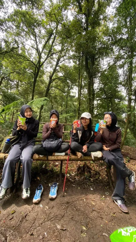 Beristirahat di area puncak yang teduh. Waktu yang pas untuk meditasi sejenak atau sekadar menikmati kopi hangat di tengah hutan.